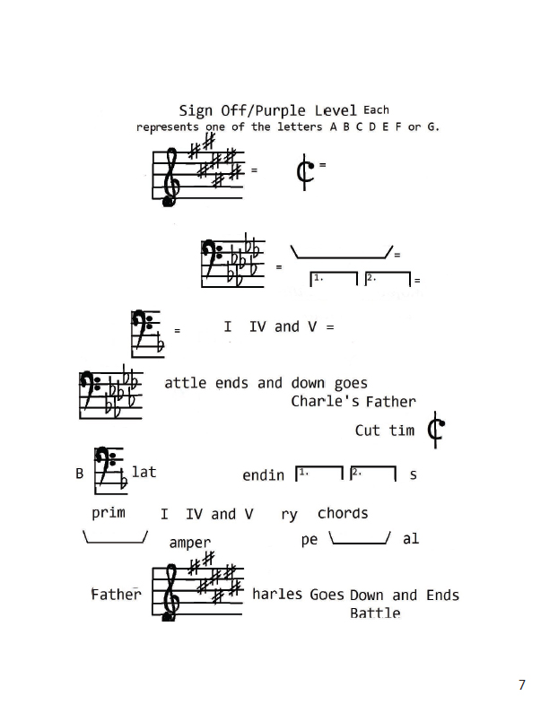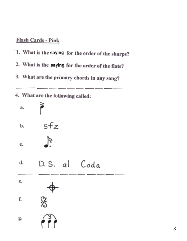 The order of sharps and flats, primary chords, signs for timing, dynamics and styles, signs to direct repeats and endings and review.